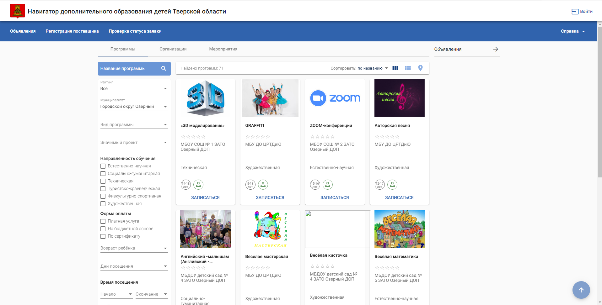 Записаться на кружок или секцию теперь просто как никогда. Введите в поисковой строке «Навигатор дополнительного образования Тверской области», зайдите на сайт навигатора и выберите в строке «Муниципалитет» - «Городской округ Озерный». Познакомьтесь с программами дополнительного образования нашего города и на карточке понравившейся нажмите кнопку «Записаться». Заполните все всплывающие графы и отправьте заявку. В течении пяти рабочих дней Вам необходимо будет подойти в выбранную Вами организацию и заключить договор.